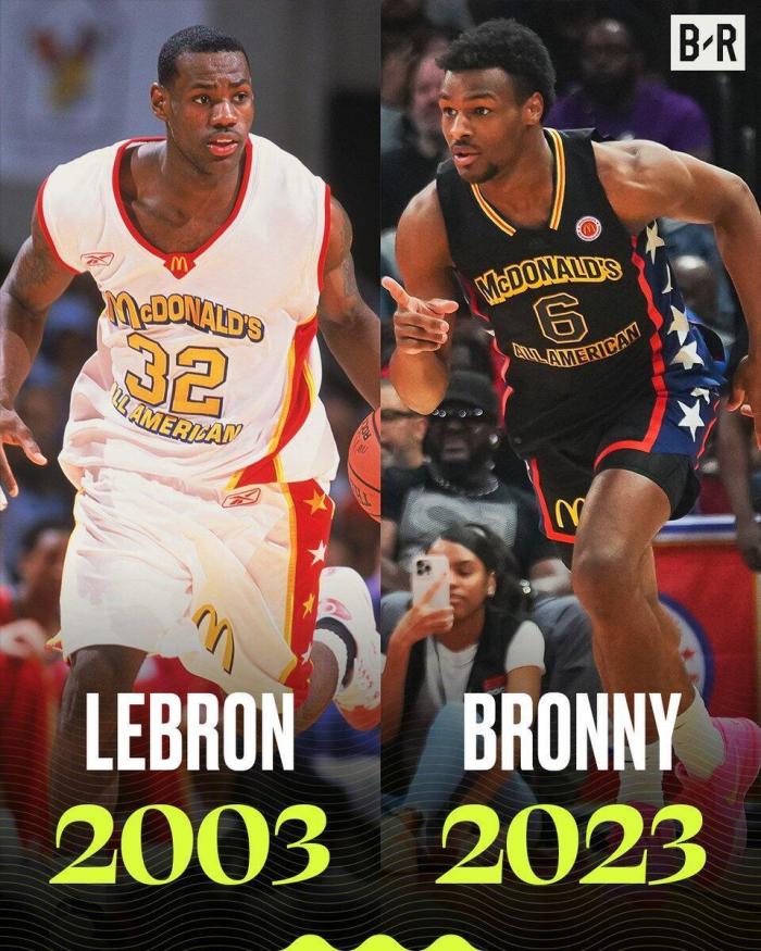 全美高中全明星赛本来就是关注度很高的比赛,而随着布朗尼的加入以及詹姆斯的现场观战,人气就更高了。美媒Bleacher Report晒出海报,写着:“有其父必有其子。”2003年,詹姆斯参加了这项赛事,20年后,他的大儿子布朗尼也入选了全美全明星赛。