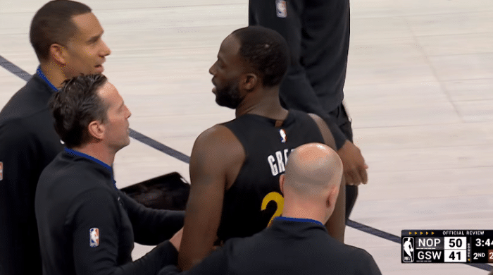 在勇士和鹈鹕比赛第三节3分44秒,英格拉姆持球进攻,格林故意用肩膀撞开英格拉姆,后者十分沮丧,拿球怒砸地板,然后与格林冲撞,两人互喷引冲突,裁判第一时间吹罚双方技犯,之后格林不满判罚,怒吼咆哮,裁判回放之后,吹罚格林一级恶犯。