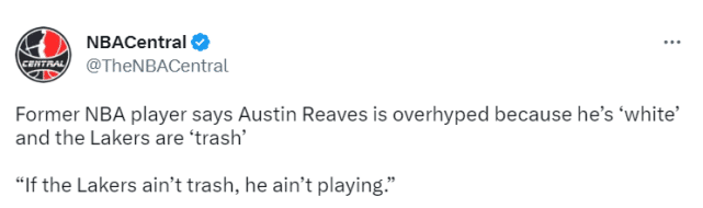 麦坎茨说道:“我和里夫斯的实力一样,但你们现在说要给他5000万美元的合同,只因为他是个白人,因为他在湖人打球,而他能在湖人打那么多比赛,得到那么大角色的原因,就是现在的湖人是垃圾。所以这就像,如果湖人不那么垃圾,里夫斯就没法得到那么多机会,打那么好。”