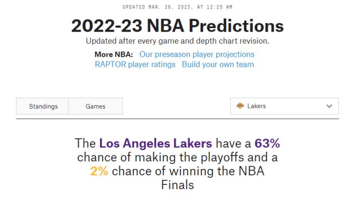 根据权威网站最新预测,湖人晋级季后赛的概率为63%。