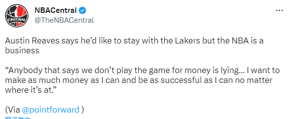 近日里夫斯在节目中谈到今夏是否愿意和湖人续约,他表示:我想留在湖人,但NBA就是一场生意。任何说球员打比赛不是为了钱的人都是在说谎。所以,我想尽可能多地赚钱,无论在哪里赚到这些钱。