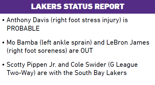 JRS直播网03月24日,湖人官宣下一场对阵雷霆的伤病报告,詹姆斯(右脚伤势)、班巴(左脚踝扭伤)继续休战,浓眉(右脚压力伤势)大概率出战,75%可能性出战;小皮蓬和斯威德因下放发展联盟也不会出战;浓眉预计将带队冲击三连胜。