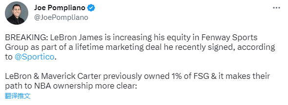 Joe Pompliano表示这使得詹姆斯以后购买NBA球队的道路更加清晰。