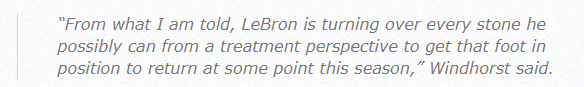 据ESPN记者BrianWindhorst报道,从治疗的角度来讲,勒布朗正在竭尽所能地尝试一切手段,以让他的脚达到能在本赛季的某个时候回归的状态。