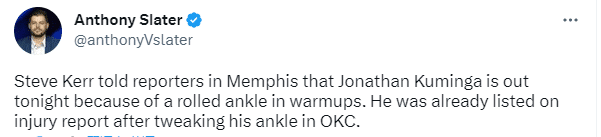 JRS直播网讯03月10日,勇士新星库明加遭遇杜兰特式悲剧,因伤无缘出战灰熊,据勇士主帅科尔透露,库明加在赛前热身时扭伤了脚踝,将缺席今日比赛。