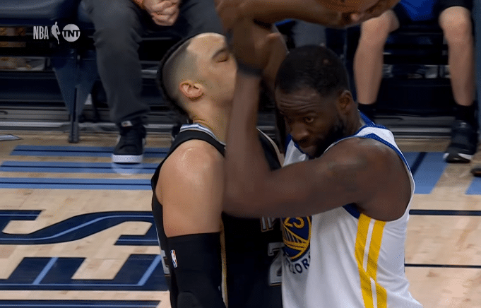 JRS直播网讯03月10日,勇士客场大战灰熊,上半场最后阶段,格林和狄龙险些发生冲突,两人发生身体接触,暗暗较劲火药味十足,格林用手和手臂压在狄龙的脸上。