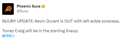在太阳对阵雷霆赛前,杜兰特热身时不幸滑倒受伤,从现场画面可以看出,杜兰特的左脚踝呈90度扭伤,如此意外受伤太离谱;之后太阳官方宣布杜兰特因左脚踝酸痛退出比赛,克雷格顶替杜兰特进入首发阵容。