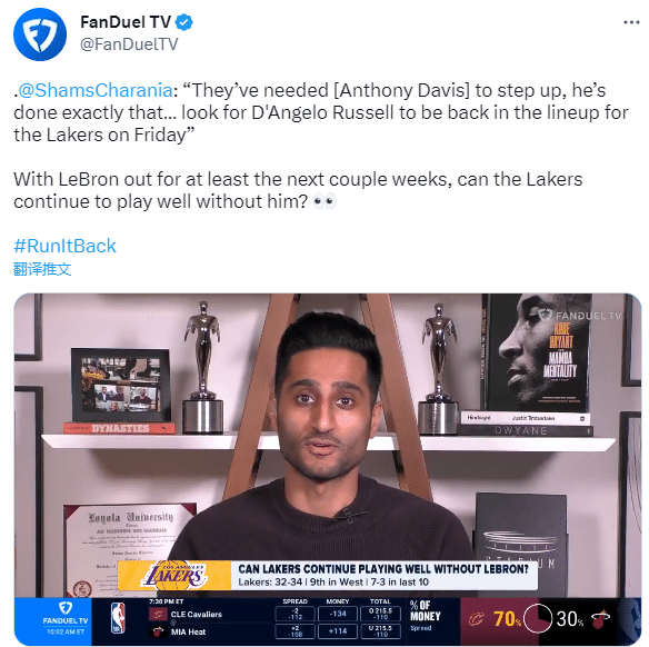 名记Shams在节目中表示:关注拉塞尔,预计他会在周六回归,本来是希望他昨天回归的,不过湖人在没他的情况下也赢了,所以我们可以期待拉塞尔周六回归阵容。