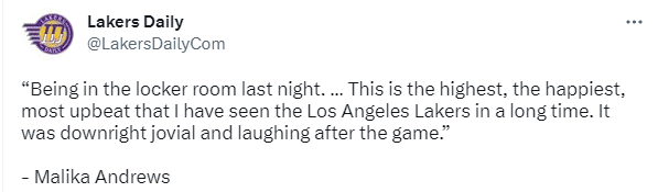 据NBA记者Malika Andrews透露,昨晚赢球赛后,湖人的更衣室中出现了我很长一段时间以来看到过的最热烈、最快乐且最积极的氛围,赛后充满了欢乐的笑声,安东尼-戴维斯告诉我他感觉非常棒,他们想要变得更好,想要每晚都更进一步。