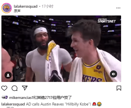 湖人击败灰熊赛后,上半身仅仅穿着紧身衣的浓眉,抱着里夫斯开怀庆祝,并且喊队友的绰号:乡村科比。