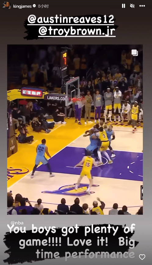 詹姆斯还在Ins上夸赞里夫斯和小布朗,转发视频并配文写道:你们两个小子太会打球了吧!我爱你们的这个关键表现。