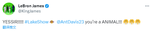 由于伤病康复的原因,詹姆斯没有来到场边观战,但湖人赢球后,老詹在社媒上庆祝,先是发推狂砍浓眉:太棒了,湖人秀,浓眉你真是野兽。