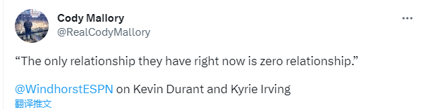 名记Brain Windhorst表示:在昨日太阳和独行侠的比赛中,杜兰特和欧文甚至都不看彼此一眼。在比赛期间,有很多次两人擦身而过,但他们都没有回头,甚至在暂停时也一样。在比赛结束后,杜兰特拥抱了才共事几个月的前队友大莫里斯,但一眼也没望向欧文的方向。