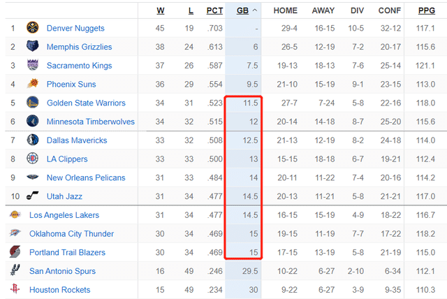 目前来看整个西部的格局,掘金拿下第1没有悬念,灰熊、国王和太阳对于2-4位的争夺仍有悬念。而从第5的勇士到第13的开拓者,只有3.5个胜场的差距。尤其是第9的鹈鹕到第13的开拓者,5队更是只有1个胜场差。这样的形势可以称得上惨烈,稍有不慎就可能无缘季后赛,当然对于观众来说,则是非常刺激。
