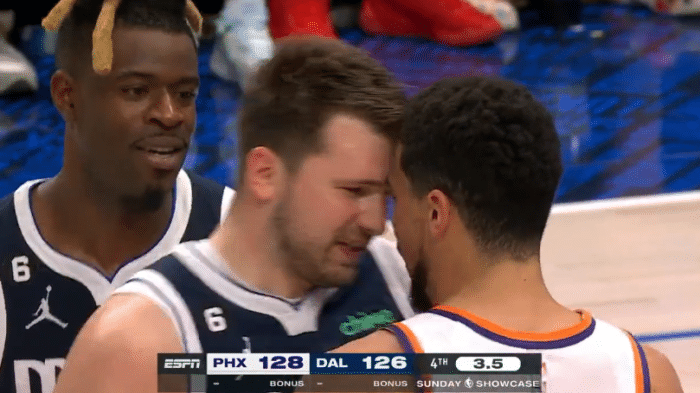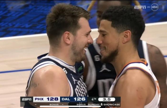 末节关键时刻,杜兰特无解中投准绝杀,东契奇晃飞防守人却错失空位绝平球,之后东契奇主动申请犯规,还剩3.5秒,布克和东契奇说着说着,东契奇被惹怒了,和布克顶牛互喷,杜兰特、布洛克等人都赶紧过来劝架,不过两人喷着喷着突然笑场,笑着互喷的冲突一幕甚至有些搞笑,杜兰特也跟着笑了。