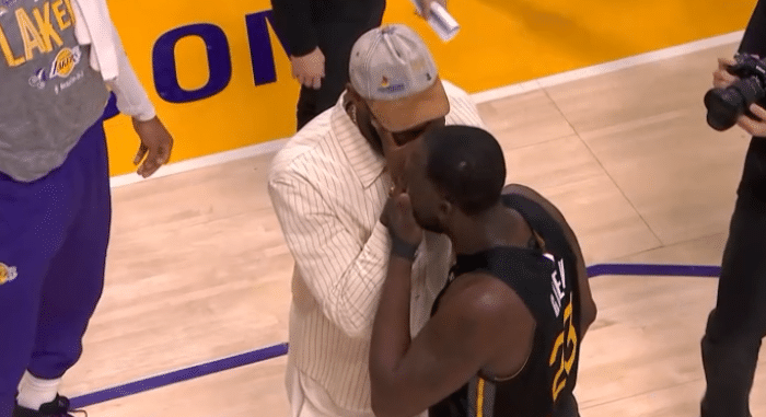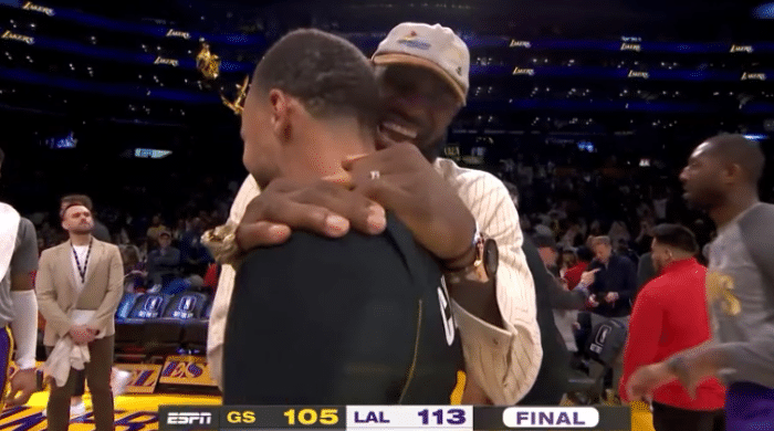湖人击败勇士赛后,詹姆斯先是和格林寒暄,两人捂嘴交流,生怕被别人看出来他们说了什么话;之后詹姆斯拥抱库里,而且两人开怀热聊,詹姆斯咧嘴大笑十分开心;库里离场前还拥抱拉塞尔和浓眉,今日是库里连续伤停11场后复出首战,全场20投8中拿到27分6助攻,末节独砍19分仍输掉比赛。