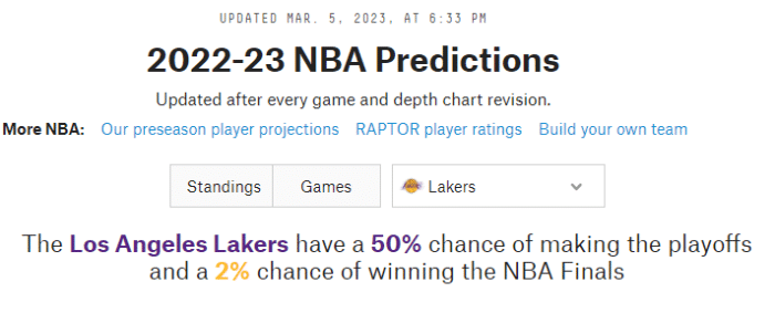 湖人击败勇士后战绩变成31胜34负,排在西部第11位,落后西部第6的森林狼2.5个胜场,西部季后赛之争十分激烈,湖人随时都可能重返西部前十;根据权威网站FiveThirty Eight的最新预测,湖人晋级季后赛概率上升到50%,有2%的机会夺得总冠军。