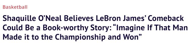 对于湖人球迷来说,奥尼尔描绘的故事当然很美好,但现实往往比较残酷。湖人只能先期待詹姆斯能尽快伤愈复出,湖人才有机会去一步步创造奇迹。赛季至今,38岁的詹姆斯场均29.5分8.4篮板6.9助攻,他出战的47场比赛,湖人24胜23负,他缺席的17场比赛,湖人6胜11负。