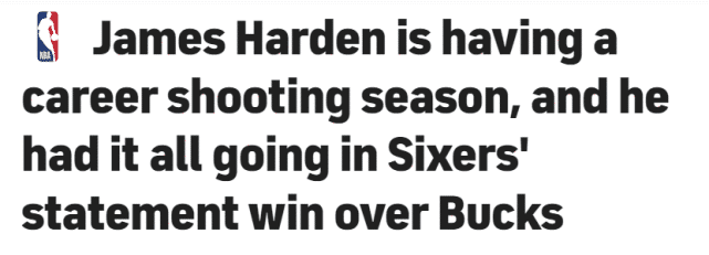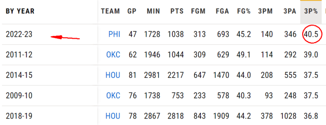 JRS直播网讯03月05日,76人133-130击败雄鹿,终结了对方的16连胜。哈登成为头号功臣,轰下38分9篮板10助攻,三分9中5。美媒CBS体育指出,哈登本赛季的三分命中率是生涯最高的表现,换言之,这是大胡子三分最准的一季。