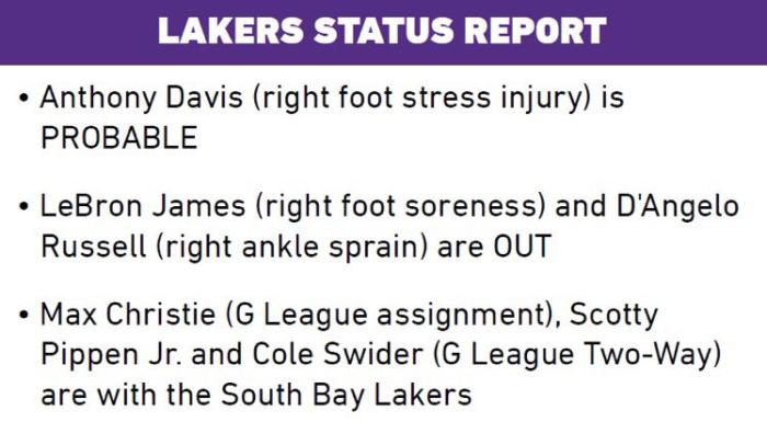 JRS直播网讯03月05日,湖人官方公布下一场对阵勇士的伤病报告,詹姆斯(右脚酸痛)和拉塞尔(右脚踝扭伤)缺席比赛,浓眉(右脚应激伤病)大概率出战,克里斯蒂、小皮蓬和斯威德都在发展联盟,也缺席与勇士的比赛;勇士队库里、伊戈达拉预计复出,维金斯仍未归队继续缺席。