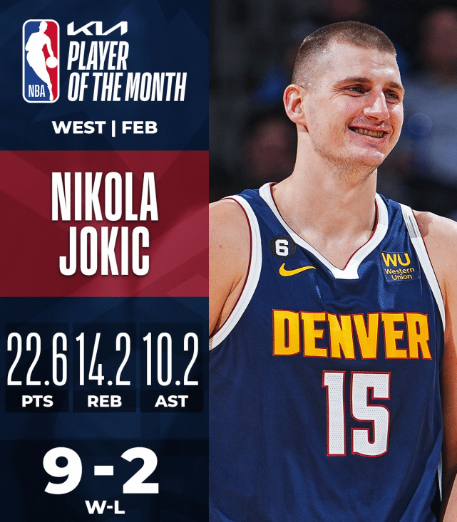 约基奇二月份场均22.6分14.2篮板10.2助攻,掘金队取得了9胜3负的成绩;需要说明的是,在一月份的评选中,约基奇就已经成功当选。这是他生涯第5次获此殊荣,目前他排名MVP榜第一位。
