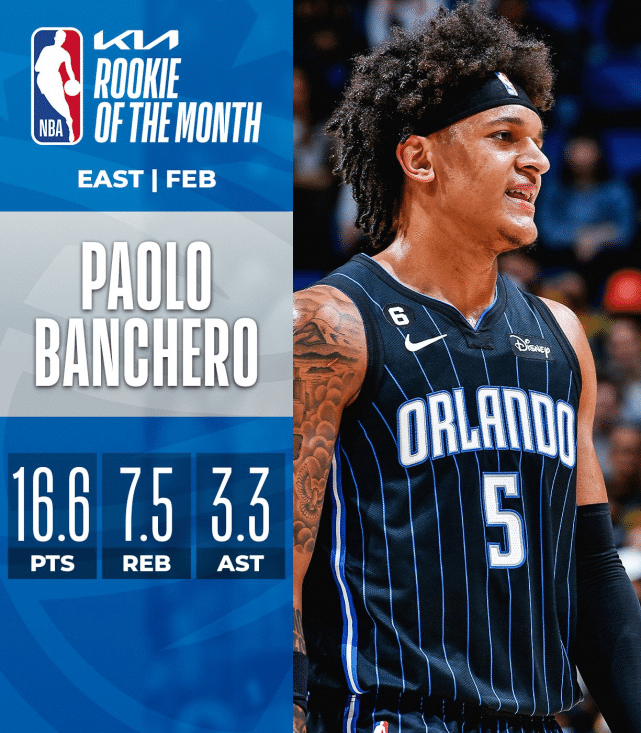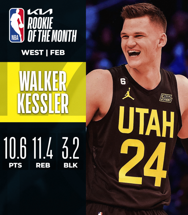 魔术队状元郎班凯罗在2月场均得到16.6分7.5篮板3.3助攻,爵士队凯斯勒场均得到10.6分11.4篮板3.2盖帽,两人成功当选月最佳新秀。