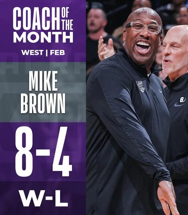 迈克-布朗在2月份率领国王取得8胜4负的战绩,目前国王队高居西部第3位。