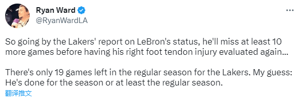 湖人记者Ryan Ward发推写道:根据湖人的最新伤病报告,在接受再次评估前,詹姆斯将因右脚肌腱伤势缺席至少10场。湖人本赛季的常规赛还剩19场。我的猜测詹姆斯本赛季至少不会再出战常规赛。