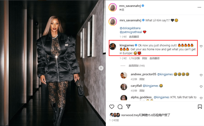 JRS直播网讯02月26日,近日詹嫂萨瓦娜参加米兰时装周,身穿蕾丝透视打底出镜,性感亮相并且拍摄大片,38岁詹姆斯在老婆评论区留言写道:赶紧给我回家,家里有你在欧洲得不到的东西。