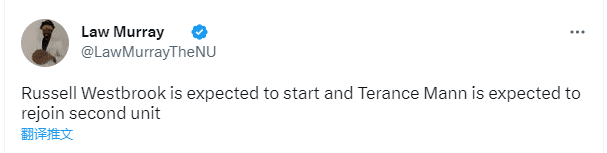 JRS直播网讯02月25日,据快船随队记者Law Murray报道,球队新援威少预计将首发出战,特伦斯-曼恩预计将回到第二阵容;名记揭秘快船签约威少内幕,乔治力排众议获小卡支持。