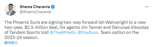 JRS直播网讯02月25日,据名记Shams Charania报道,经纪人透露,太阳与前锋伊什-韦恩莱特签下一份2年250万美元的合同。其中合同第二年(2023-24赛季)为球队选项,恭喜太阳肌肉哥正式转正,助四巨头冲击总冠军。