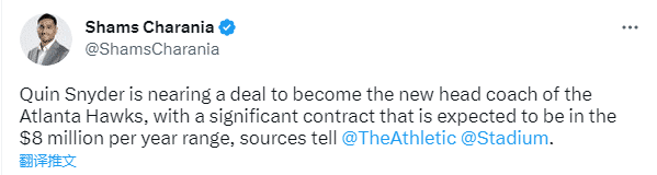 JRS直播网讯02月25日,据名记Shams报道,前爵士主教练斯奈德接近成为老鹰新主帅,年薪预计约800万美元,预计他将重拾教鞭,执教特雷-杨和穆雷带队冲击季后赛。