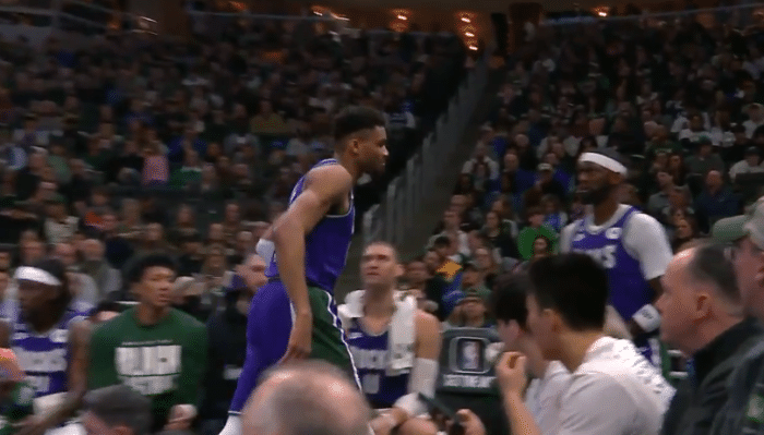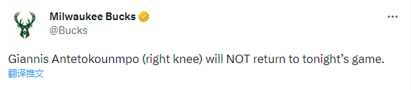 第一节还剩1分多钟,字母哥持球进攻,本来想要背打阿德巴约,奥拉迪波想要上抢,字母无接触突然受伤并且申请下场,第一时间示意教练组喊暂停,然后字母哥一瘸一拐,径直离场返回更衣室;字母哥受伤离场,初步检查之后,雄鹿官方宣布,字母哥因右膝受伤,本场比赛不会回归。