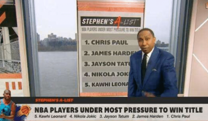 JRS直播网讯02月24日,NBA现役球员之中谁的夺冠压力最大?美名嘴斯蒂芬-A-史密斯在节目中,列出了他心目中夺冠压力最大的球员,在这份名单的球员有:克里斯-保罗、詹姆斯-哈登、杰森-塔特姆、尼古拉-约基奇和科怀-莱昂纳德。