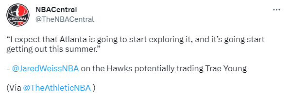 JRS直播网讯02月24日,据NBA记者Jared Weiss报道,预计老鹰将在探索交易特雷-杨,并且将在今夏开始兜售他;目前老鹰正在积极签约新的主教练,正专注于聘请斯奈德担任球队新帅。