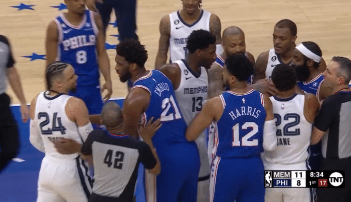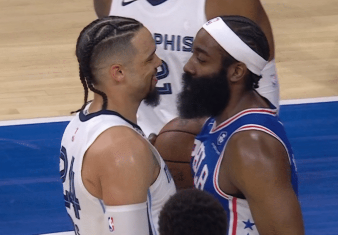 JRS直播网讯02月24日,在费城76人和灰熊比赛中,第一节场上险些发生冲突,灰熊悍将狄龙-布鲁克斯拨弄哈登的臀部引争吵,两人激烈互喷,恩比德第一时间劝架。