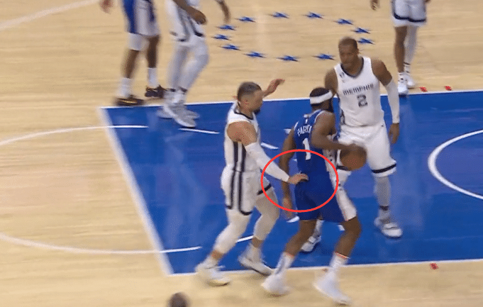第一节8分34秒,借助恩比德的挡拆,哈登持球突破狄龙的防守,后者下手拨弄大胡子的巨臀,随后两人发生口角,几乎贴面互喷险些引发冲突;恩比德第一时间冲过来,抱住并且拉开狄龙,灰熊球员也赶紧围过来劝架;狄龙被拉开后露出一脸笑容。