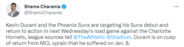 JRS直播网02月23日讯 ,太阳球星杜兰特的复出时间曝光,据名记shams报道,杜兰特计划下周四客场对阵黄蜂时复出,并且迎来太阳生涯首秀;换言之,杜兰特至少再伤停一周以及缺席2场比赛,也就是伤停20场才能重返赛场。