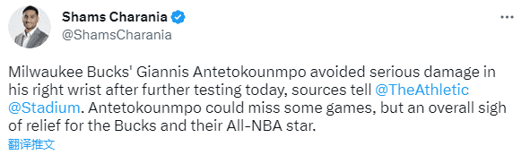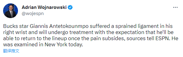 ESPN名记woj报道,雄鹿队球星扬尼斯-阿德托昆博右手腕韧带扭伤,他今天在纽约接受了检查;他将接受治疗,一旦疼痛消退,他就能重返阵容。