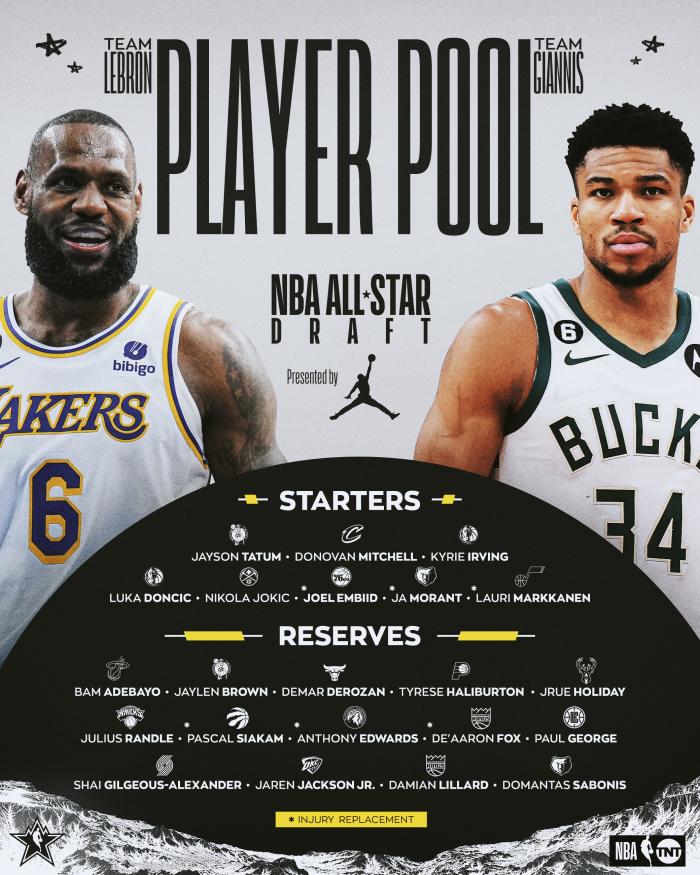 詹姆斯双手抱球坐在C位,满脸笑容,凸显队长和全明星票王的身份,詹姆斯左右两侧坐着欧文和莫兰特,坐在第一排的球星还有利拉德、福克斯;东契奇、约基奇、小贾伦-杰克逊、爱德华兹、马尔卡宁、小萨博尼斯和亚历山大都站在后排。