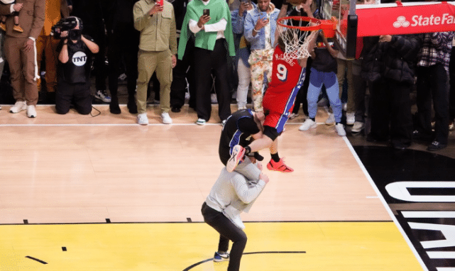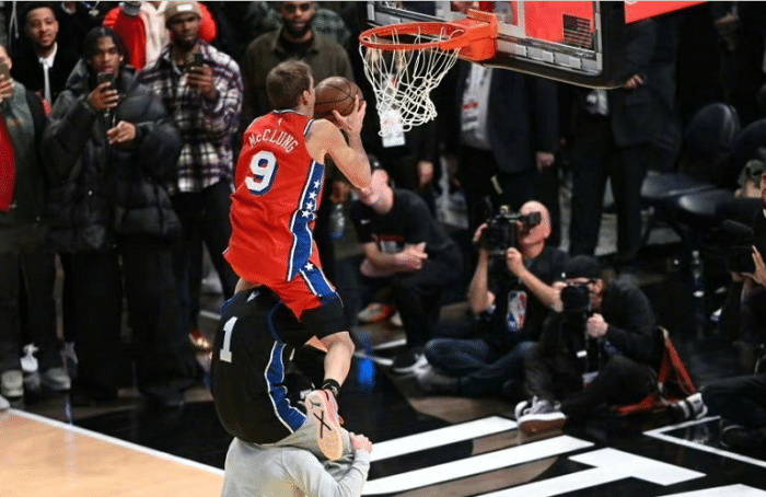 到了万众瞩目的扣篮大赛,麦克朗表现极其出色,他在预赛和决赛4次扣篮,3扣满分。第一扣超越飞跃,一个人骑在另一个背上,他直接飞跃,拉杆、打板之后扣篮,惊呆所有人。决赛的两扣也都是50分满分,唯一的丢分来自预赛第二轮,麦克朗向下的一个折叠,空中转满了360,一次成功,莱斯利给49分。