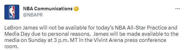 NBA官方报道,詹姆斯由于个人原因将缺席今天训练和媒体日,他将于明天接受采访;今日杜兰特、欧文、莫兰特、德罗赞以及约基奇等全明星都来到盐湖城参加媒体日和训练,老詹和恩比德目前都没有抵达盐湖城,预计明天来到这里,后者预计参加全明星正赛。