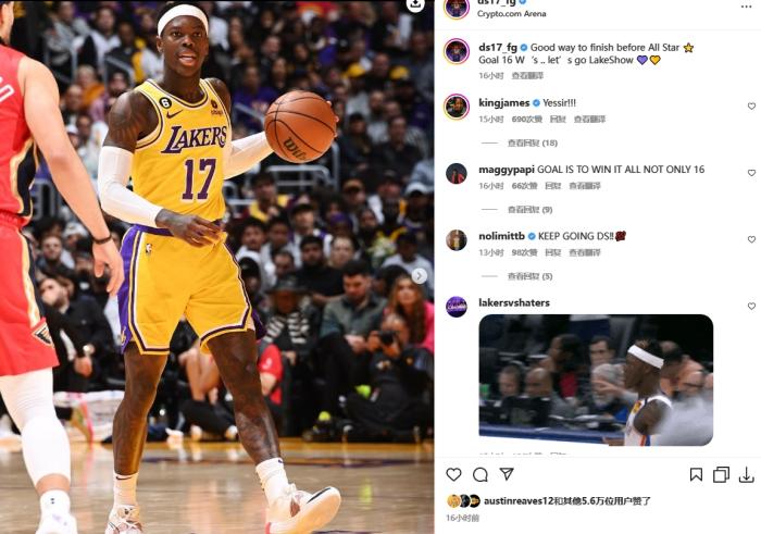 施罗德更新个人社媒晒照并配文写道:全明星结束前以胜利结束的感觉很棒!接下来的目标是取得16场胜利,冲呀紫金军团!”詹姆斯在评论区回复写道:Yessir!!!