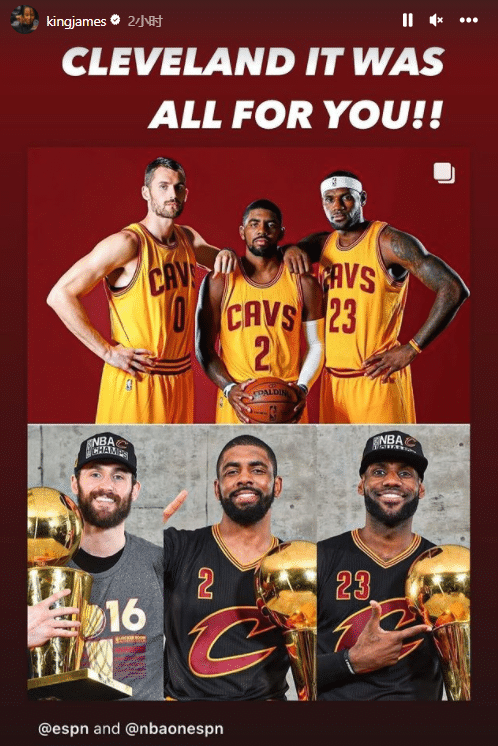 骑士2016年夺冠成员全都离队,詹姆斯晒三巨头合影和夺冠照,写道:克利夫兰,这都是给你们的!