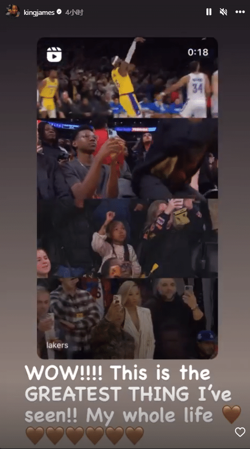 詹姆斯还转发他打进超越贾巴尔的一球时全家人疯狂庆祝的画面,当时布朗尼、布莱斯、朱莉以及萨瓦娜都站在场边疯狂庆祝,老詹配文写道:这是我人生中看过的最棒的东西!
