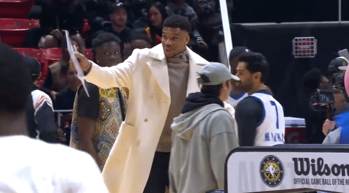 字母哥三兄弟加入韦德队教练组,字母哥身穿白色风衣并且拿着战术板入场,比赛期间,字母哥脱掉外套,坐在椅子上认真安排战术,声情并茂特别专注,韦德在外围听着听着就走开了,然后拿着一杯饮料又过来围观。