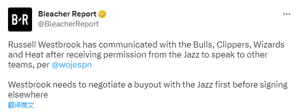 JRS直播网02月17日,威少寻找新下家最新进展,据报道,威少获准与潜在东家会面后,他已经和快船、奇才、公牛和热火四支球队进行了会面沟通,shams跟进报道,快船和威少开启对话,球队内部已经开始商讨此事;不过热火已经开始打退堂鼓,优先考虑乐福和伊巴卡。