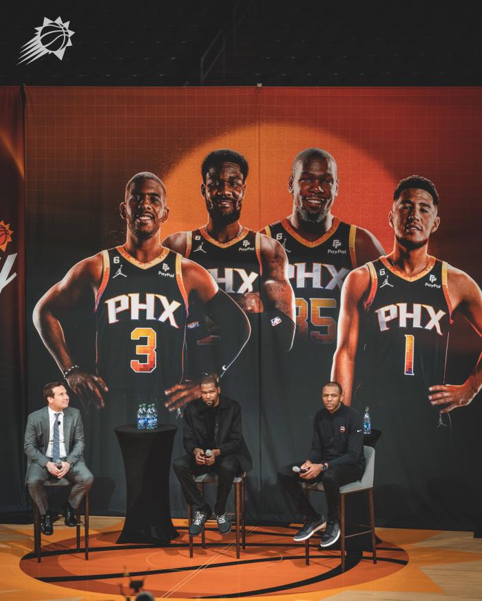 今日杜兰特正式亮相,身穿太阳队35号球衣拍摄定妆照,在新闻发布会现场,杜兰特感激篮网,直言这是非常特别的四年,祝篮网未来一切顺利。