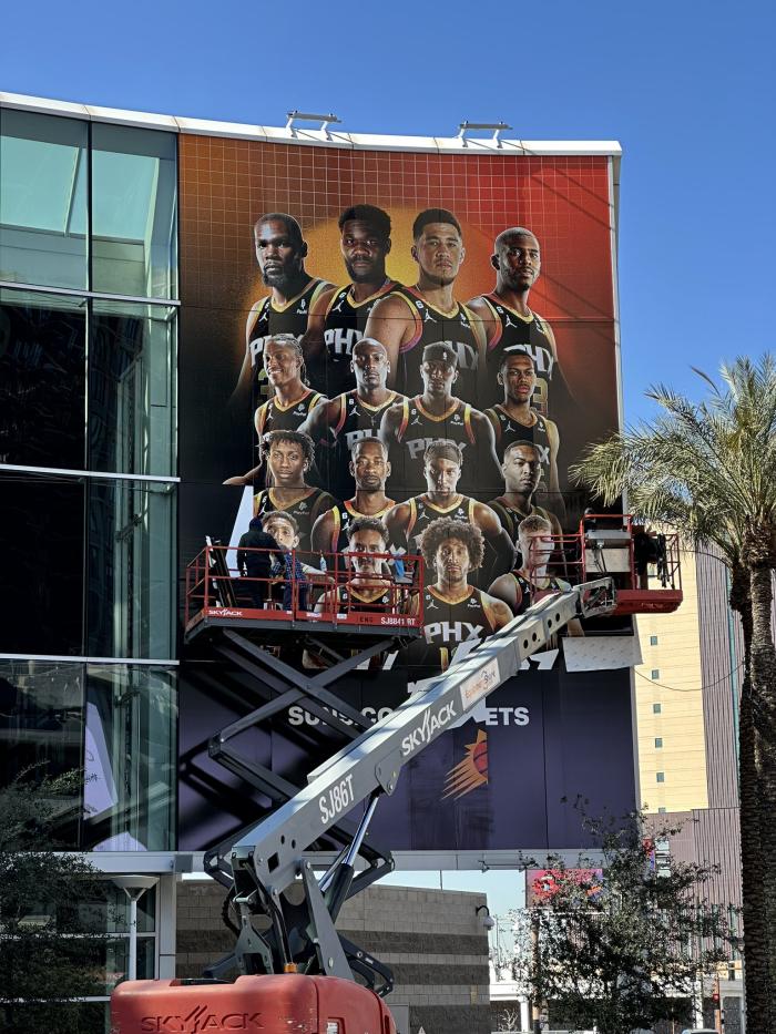 太阳巨幅海报就在球馆大门的两侧,另一侧是太阳四巨头的宣传海报。