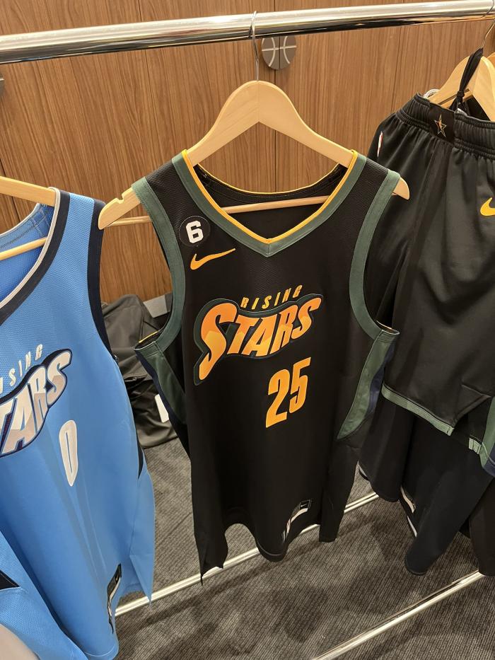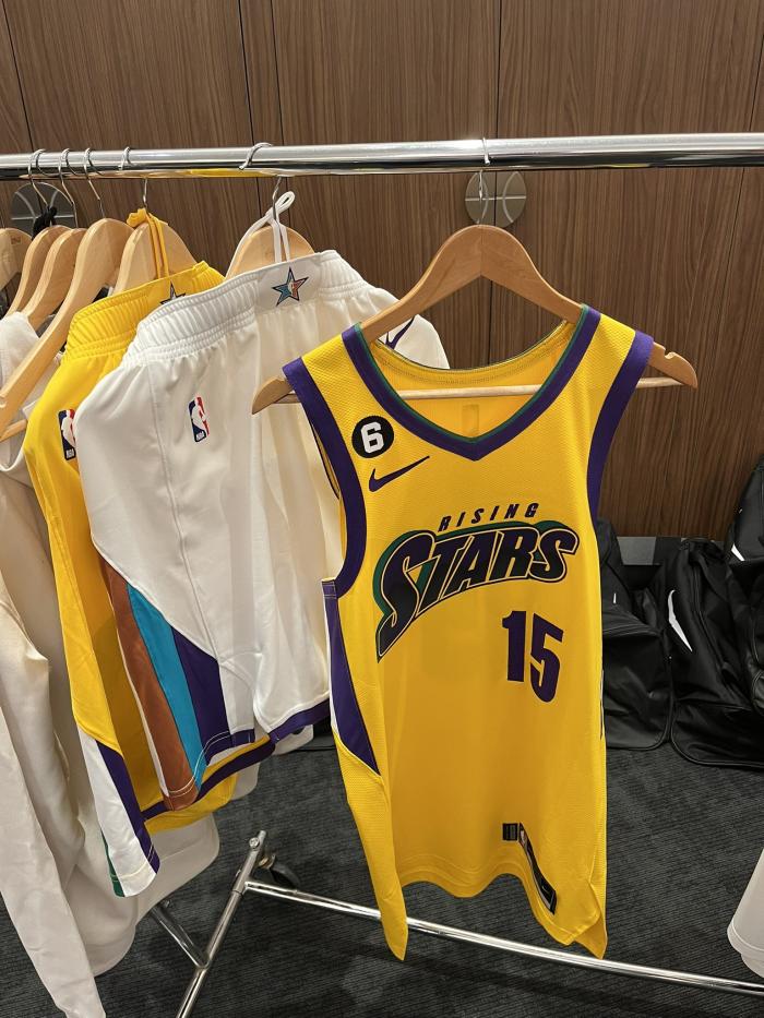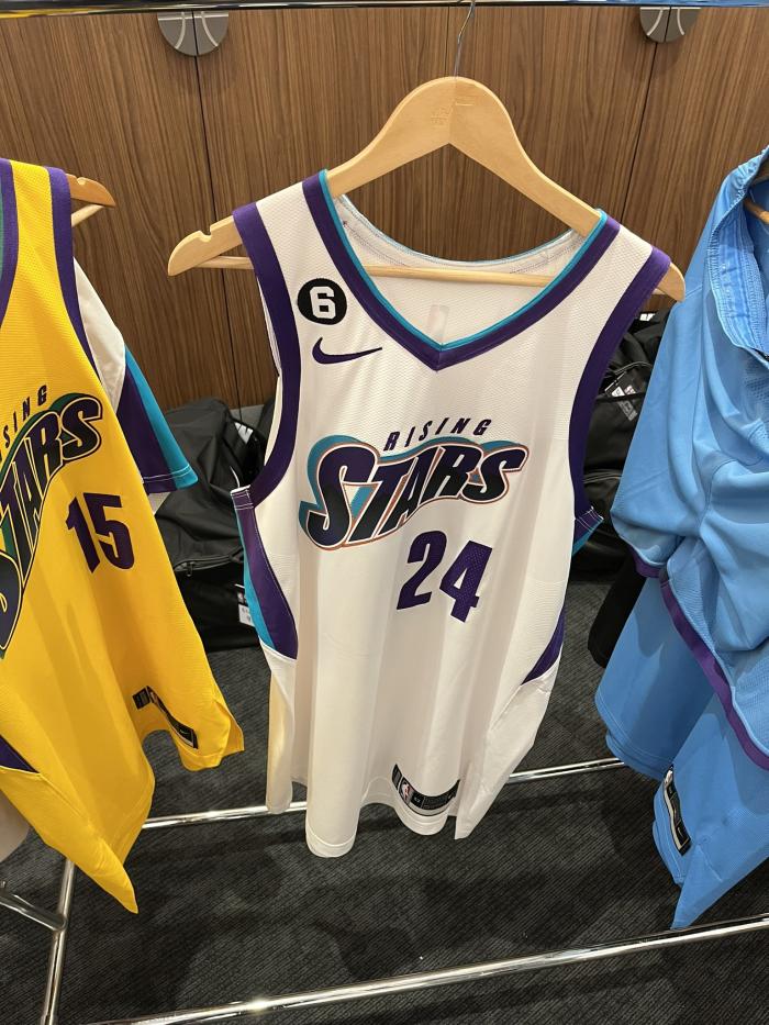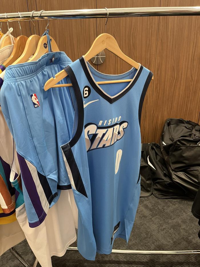 全明星新秀赛,四支球队将会身穿不同配色的球衣,这一款球衣是在爵士球衣的基础上设计的,基本上就是在爵士球衣上印上了不同的内容。